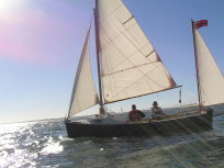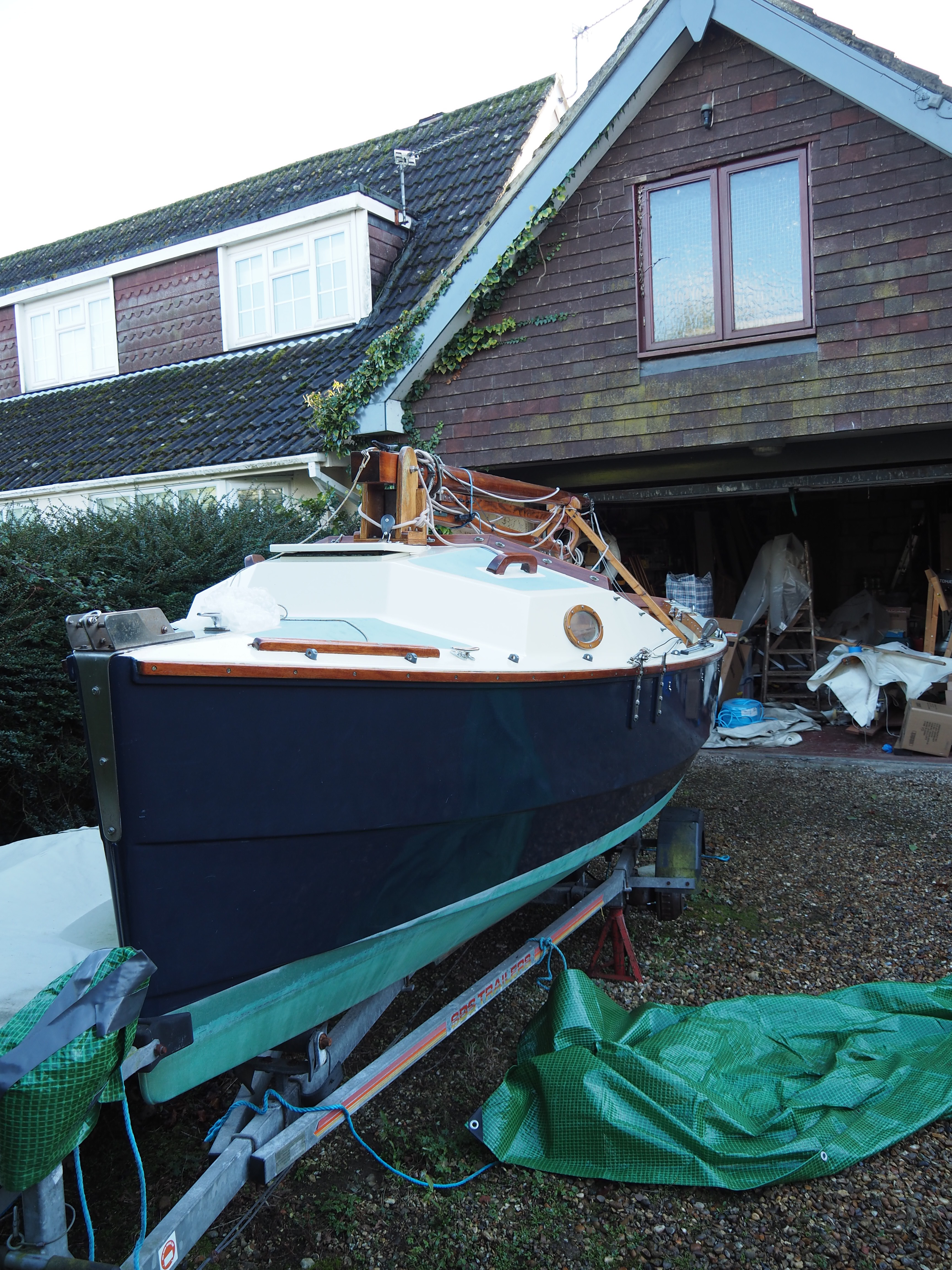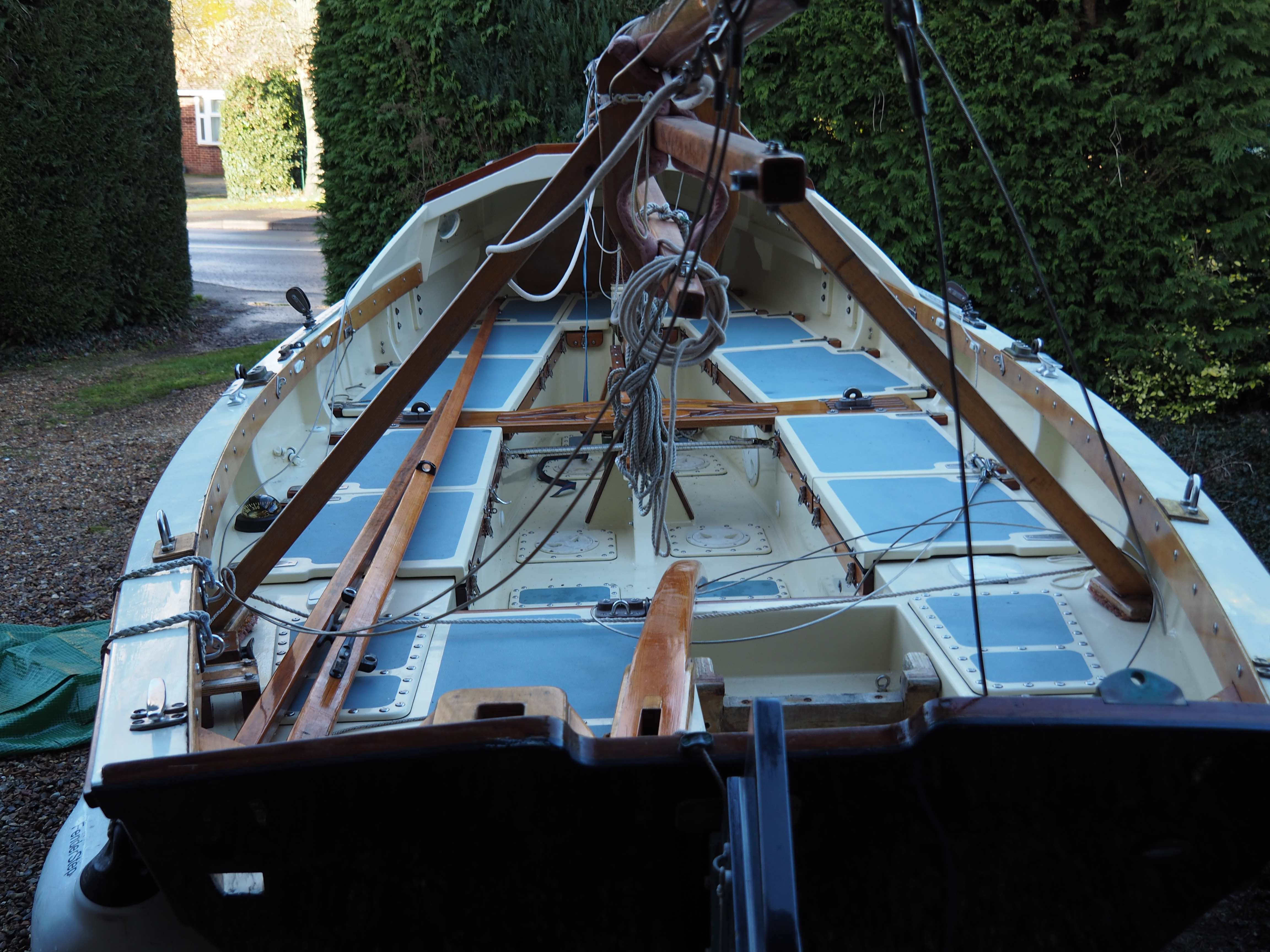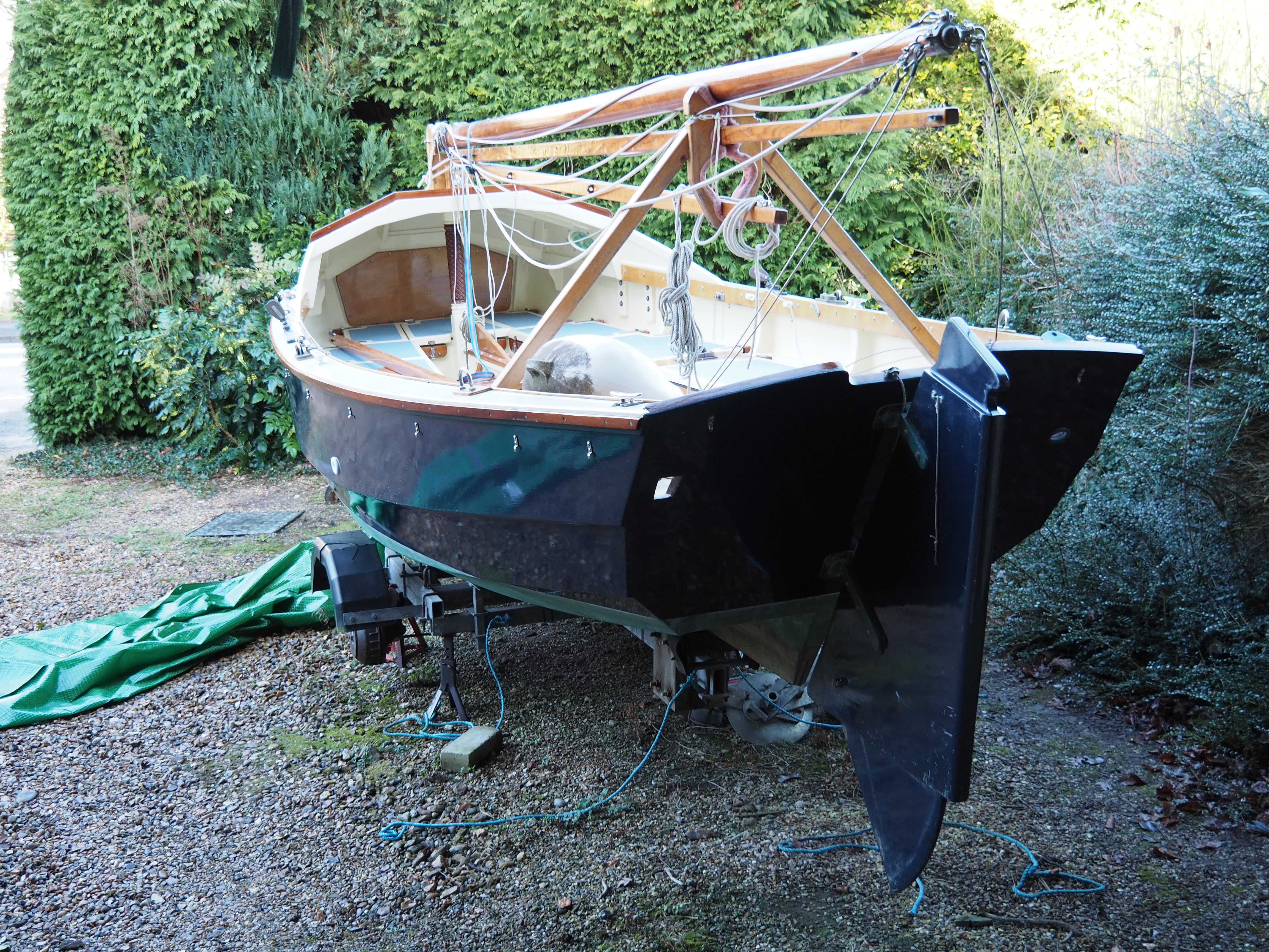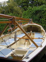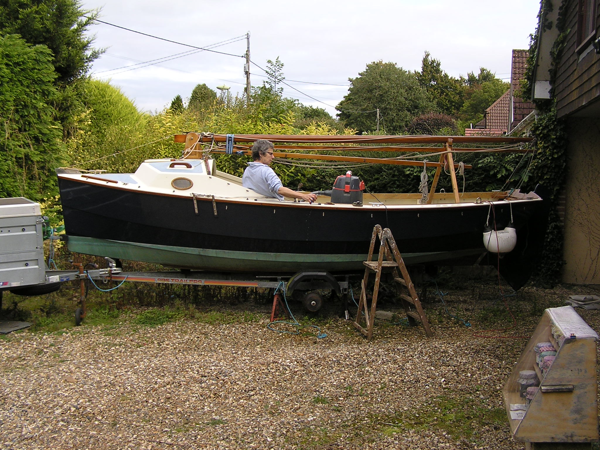 A Montage from the buildersLaunch day -- 6th Feb 2005And Our First Sail In Egret A Trip to Wooton Creek 27 Aug 2005Some photos taken from the ferry, some in the creek A Photo-shoot around Hill Head (our home base)These were taken from a distinctly light and `tippy' GRP tender in an onshore breeze that meant a lot of sculling to keep off of the shore. Some of the jaunty photo angles owe more to the dinghy's performance than to my photographic skills. The tow back into the harbour at the end was very welcome as the sculling hand was getting a little sore. A couple from later.On the way to Wooton, I think. I don't know why they're not sailing as there seems a modest breeze. Perhaps there was a tide-gate issue Egret snugged away in the tiny harbour at Hill Head on The Solent. Some recent photographs (January 2018).We'd had a green tarpauline over her, which had begun to disintegrate, so we replaced it and cleaned out the green debris. These are the "after the vacuuming" photos. With the mast and spars down, there are quite a few ropes and wires around, but most are out of the way onece the rig is up. As a gunter yawl, she has quite a few strings to pull, which is great for kids as they really feel part of the crew. We have two sets of spar sissors, this set for when the mast and spars are don and a simple set for everyday use. The mizzen mast is a simple tapered square poll that could be unstayed, but does have stays if one wants hem. The mizzen is a simple triangular sail with a "wishbone" to set the sail shape. We can't put up the mast where she is in the garden because that telephone ewire is in the way. I must put the wheel back on and move her out a bit. The bilge pumps, one each side, have diverter valves and double as ballast tank fill/empty pumps.