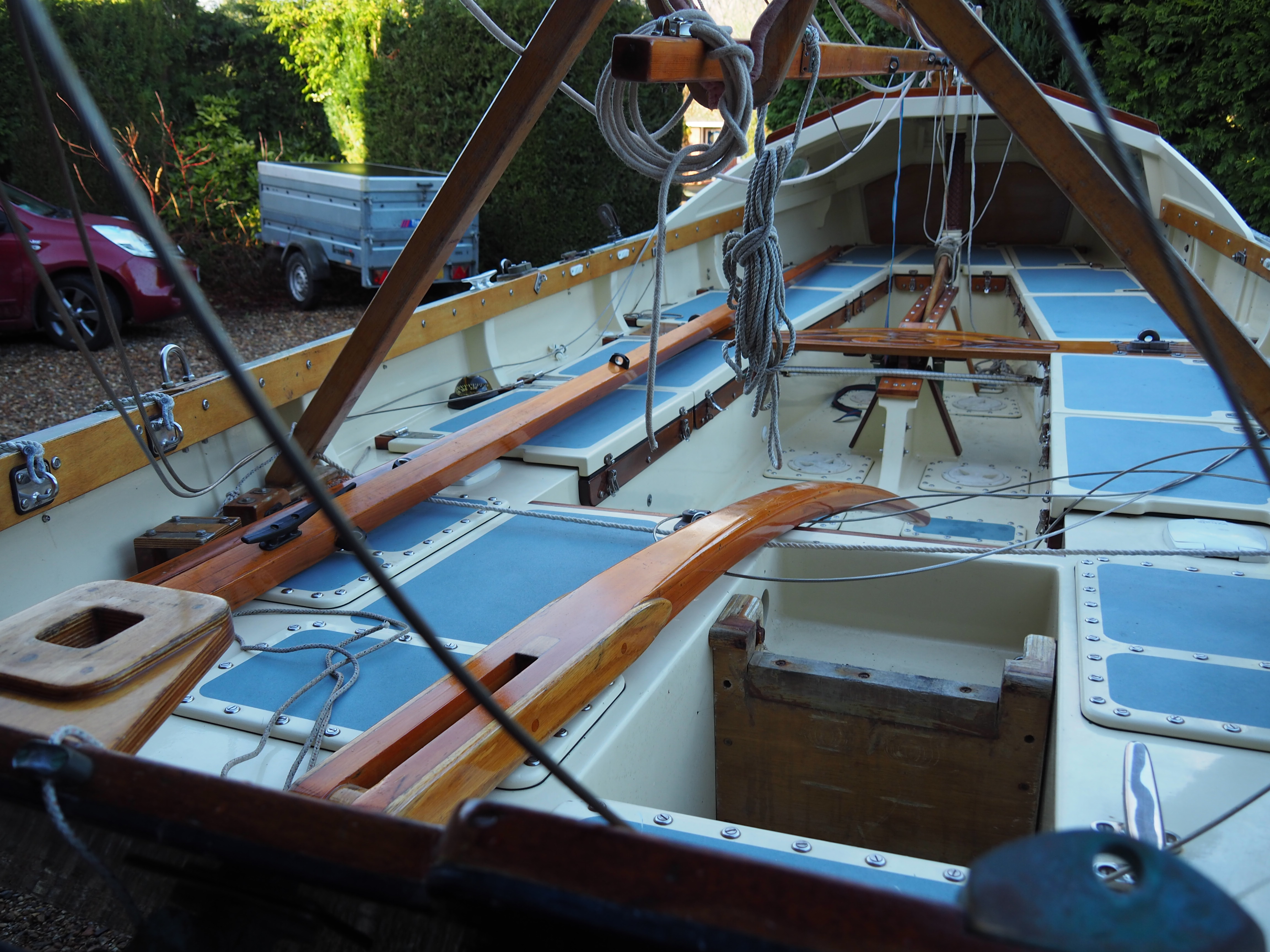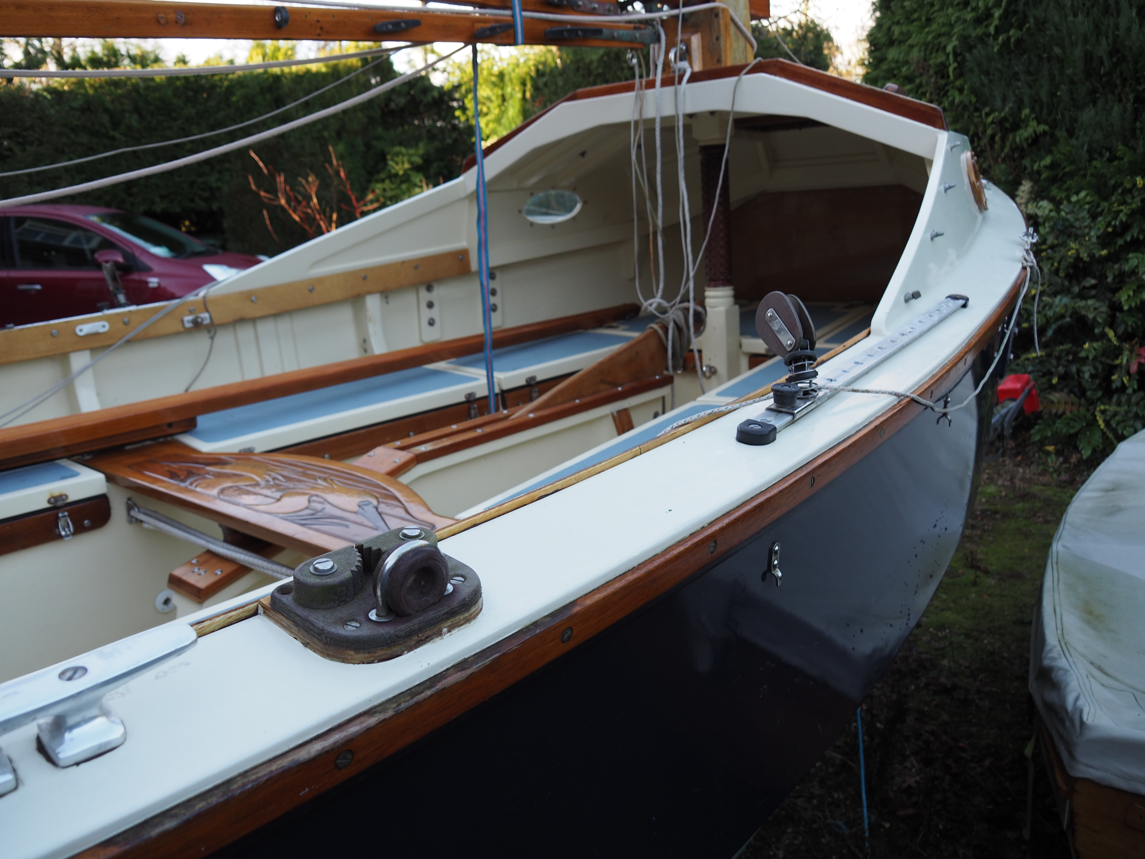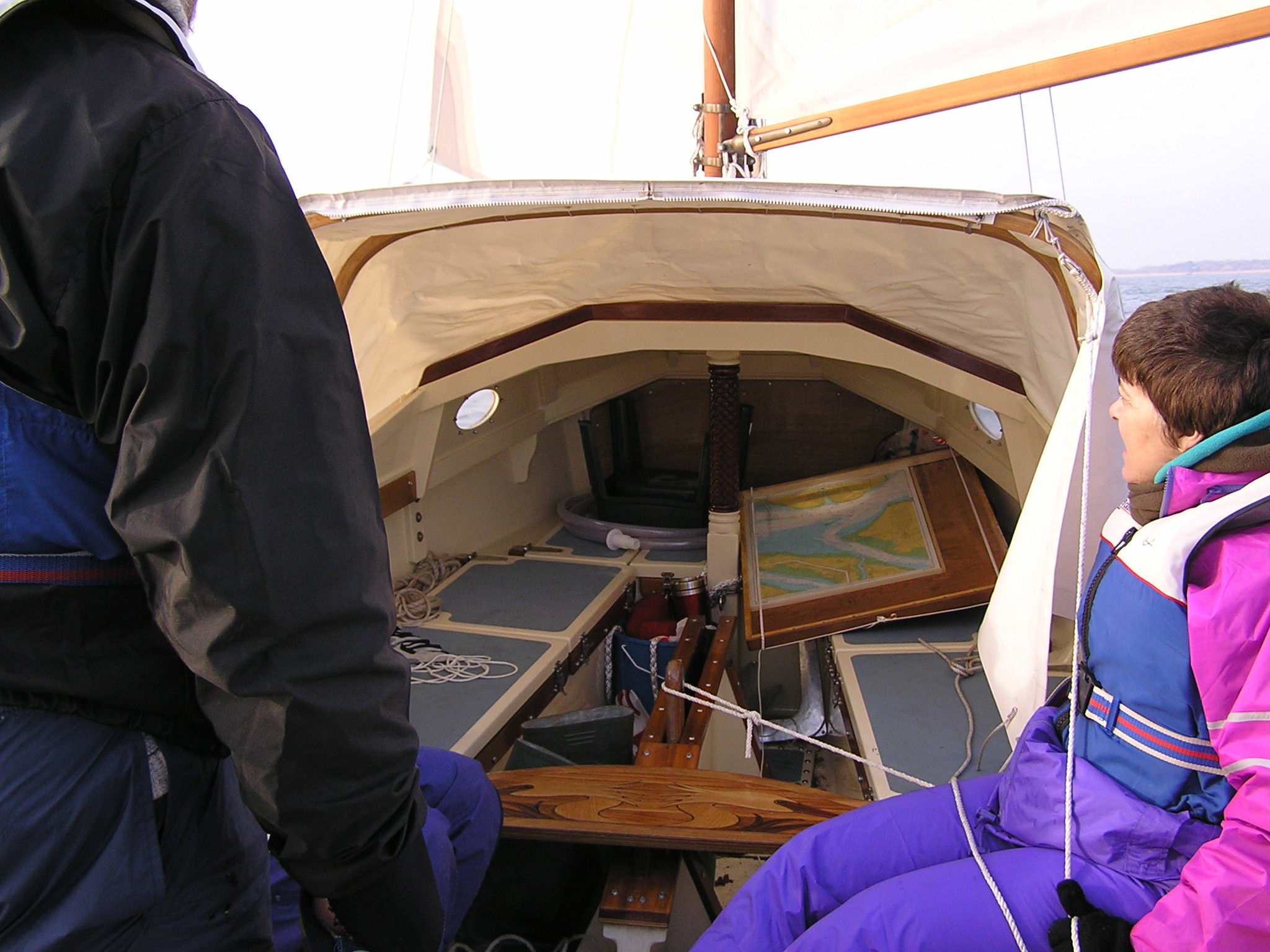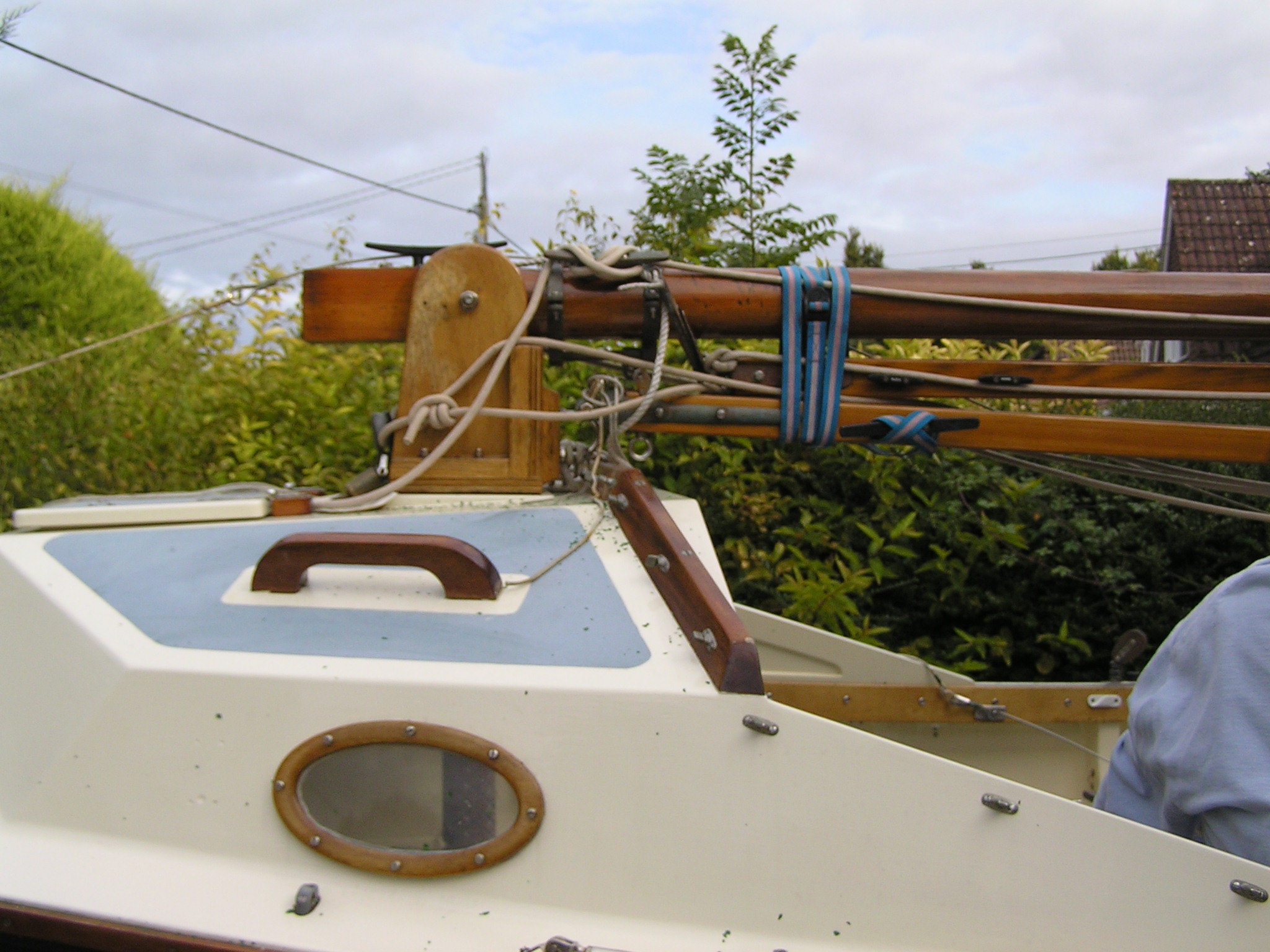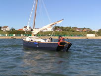A Montage from the buildersLaunch day -- 6th Feb 2005And Our First Sail In Egret A Trip to Wooton Creek 27 Aug 2005Some photos taken from the ferry, some in the creek A Photo-shoot around Hill Head (our home base)These were taken from a distinctly light and `tippy' GRP tender in an onshore breeze that meant a lot of sculling to keep off of the shore. Some of the jaunty photo angles owe more to the dinghy's performance than to my photographic skills. The tow back into the harbour at the end was very welcome as the sculling hand was getting a little sore. A couple from later.On the way to Wooton, I think. I don't know why they're not sailing as there seems a modest breeze. Perhaps there was a tide-gate issue Egret snugged away in the tiny harbour at Hill Head on The Solent. Some recent photographs (January 2018).We'd had a green tarpauline over her, which had begun to disintegrate, so we replaced it and cleaned out the green debris. These are the "after the vacuuming" photos. With the mast and spars down, there are quite a few ropes and wires around, but most are out of the way onece the rig is up. As a gunter yawl, she has quite a few strings to pull, which is great for kids as they really feel part of the crew. We have two sets of spar sissors, this set for when the mast and spars are don and a simple set for everyday use. The mizzen mast is a simple tapered square poll that could be unstayed, but does have stays if one wants hem. The mizzen is a simple triangular sail with a "wishbone" to set the sail shape. We can't put up the mast where she is in the garden because that telephone ewire is in the way. I must put the wheel back on and move her out a bit. The bilge pumps, one each side, have diverter valves and double as ballast tank fill/empty pumps.