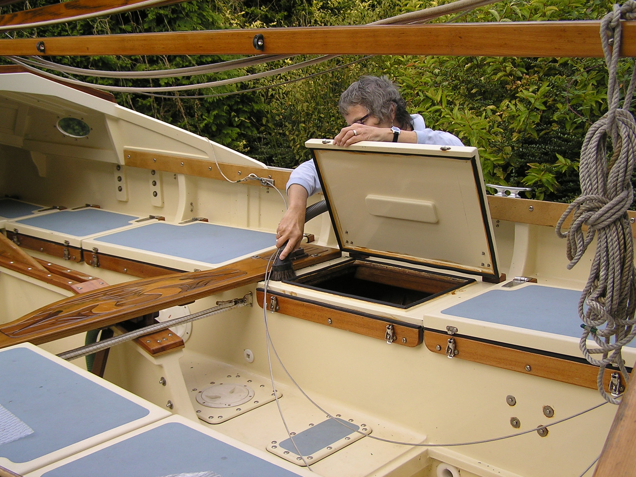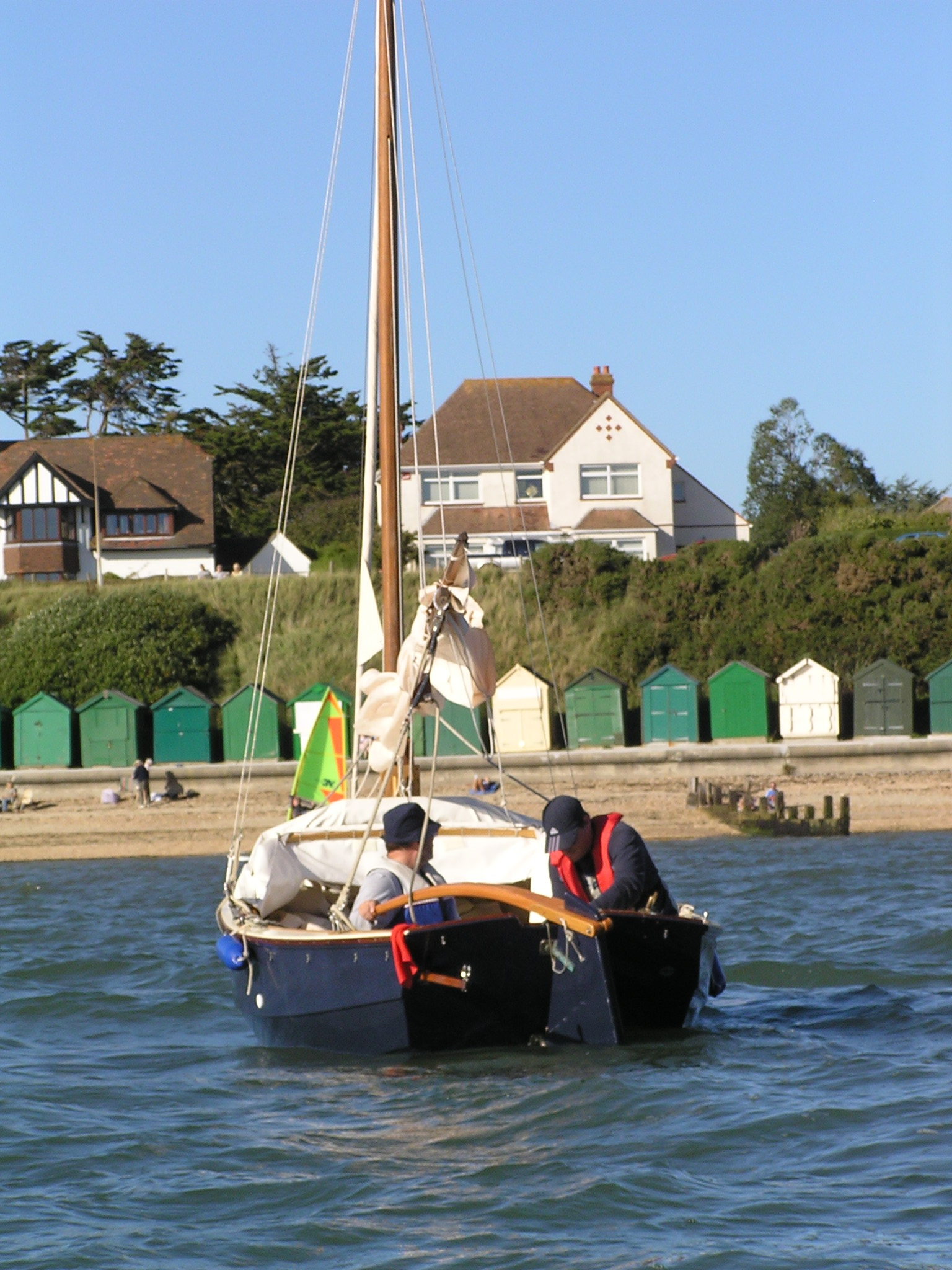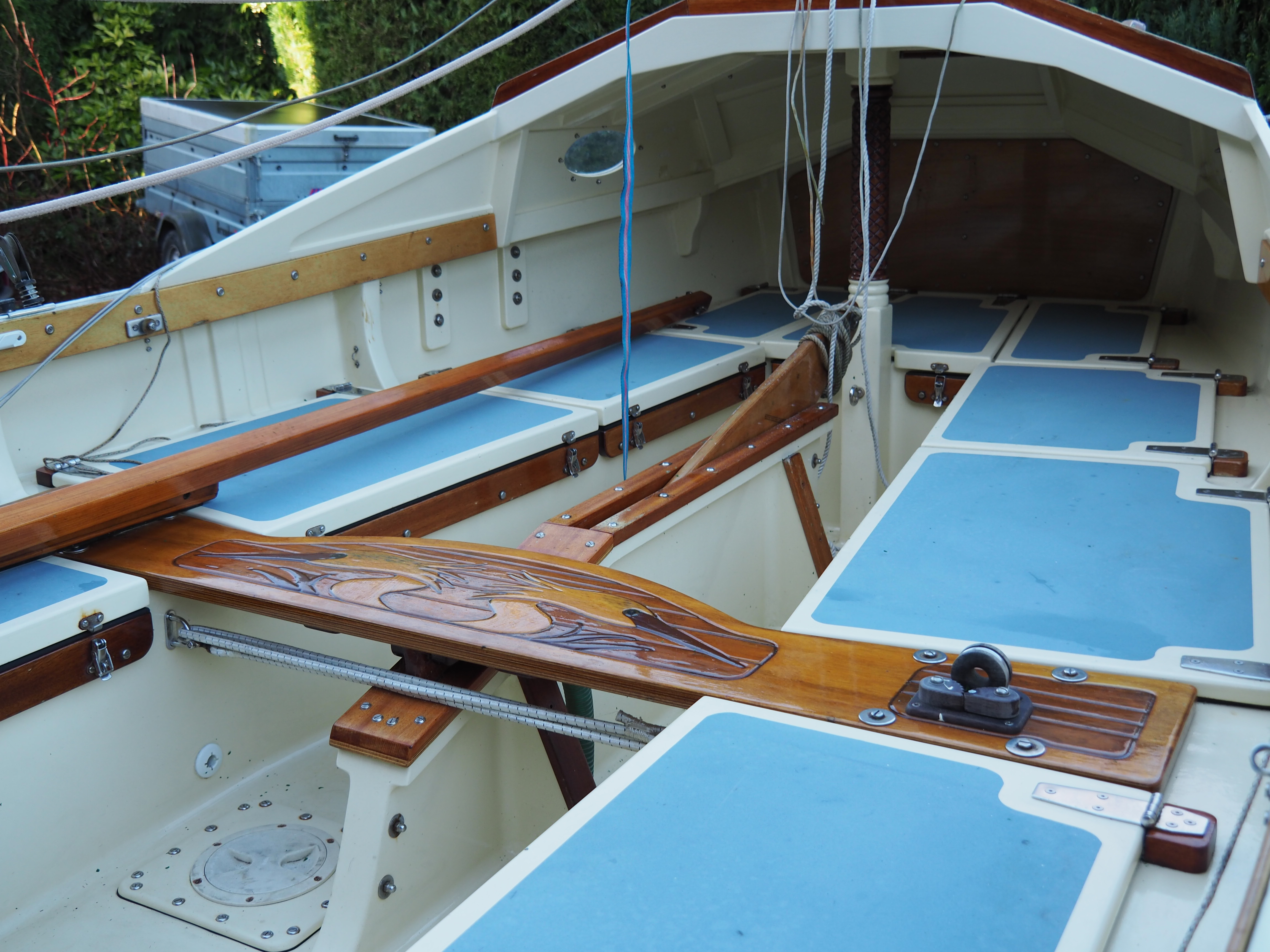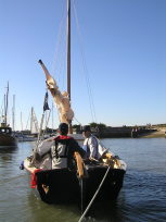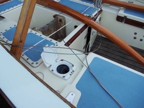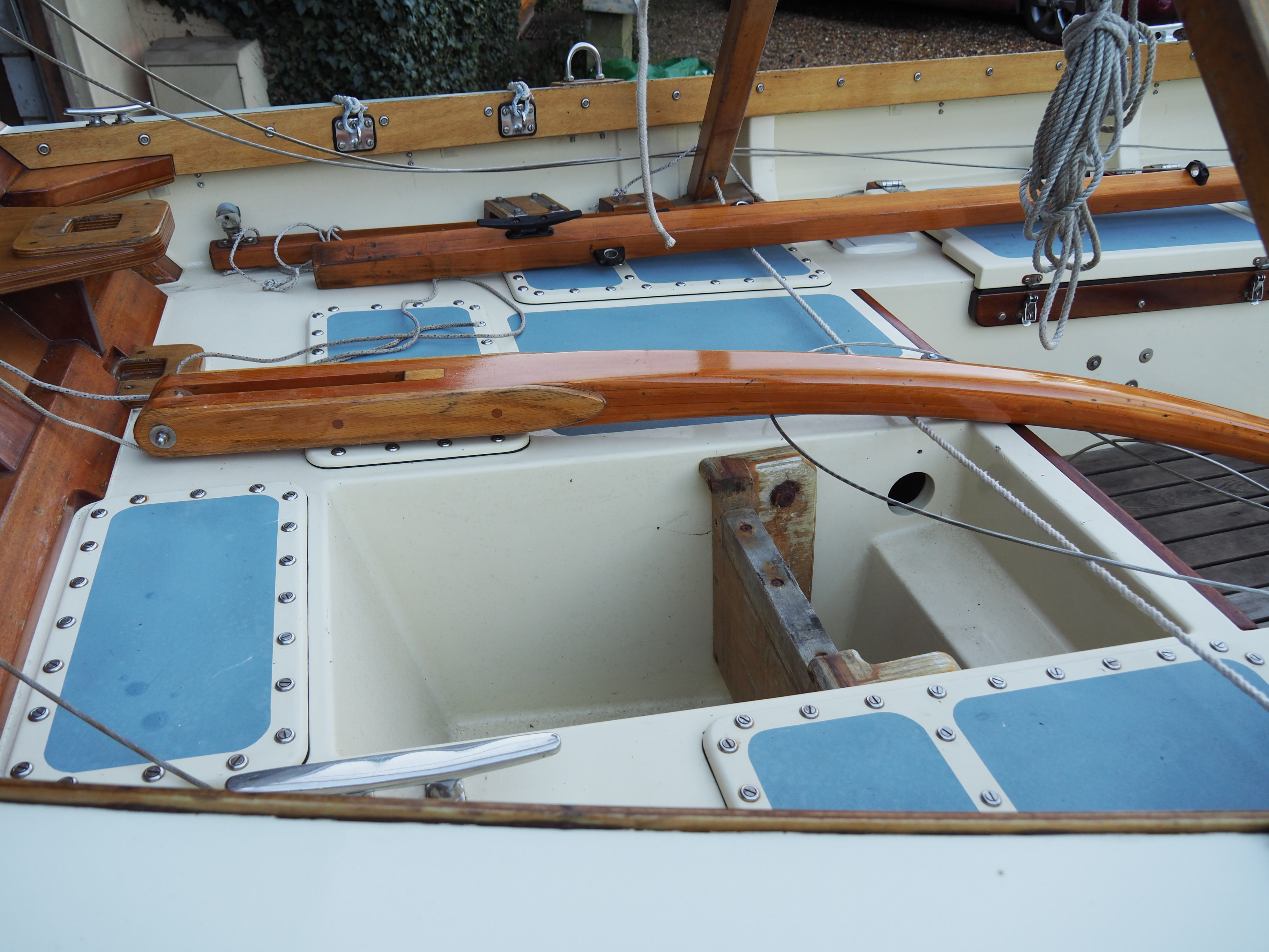 A Montage from the buildersLaunch day -- 6th Feb 2005And Our First Sail In Egret A Trip to Wooton Creek 27 Aug 2005Some photos taken from the ferry, some in the creek A Photo-shoot around Hill Head (our home base)These were taken from a distinctly light and `tippy' GRP tender in an onshore breeze that meant a lot of sculling to keep off of the shore. Some of the jaunty photo angles owe more to the dinghy's performance than to my photographic skills. The tow back into the harbour at the end was very welcome as the sculling hand was getting a little sore. A couple from later.On the way to Wooton, I think. I don't know why they're not sailing as there seems a modest breeze. Perhaps there was a tide-gate issue Egret snugged away in the tiny harbour at Hill Head on The Solent. Some recent photographs (January 2018).We'd had a green tarpauline over her, which had begun to disintegrate, so we replaced it and cleaned out the green debris. These are the "after the vacuuming" photos. With the mast and spars down, there are quite a few ropes and wires around, but most are out of the way onece the rig is up. As a gunter yawl, she has quite a few strings to pull, which is great for kids as they really feel part of the crew. We have two sets of spar sissors, this set for when the mast and spars are don and a simple set for everyday use. The mizzen mast is a simple tapered square poll that could be unstayed, but does have stays if one wants hem. The mizzen is a simple triangular sail with a "wishbone" to set the sail shape. We can't put up the mast where she is in the garden because that telephone ewire is in the way. I must put the wheel back on and move her out a bit. The bilge pumps, one each side, have diverter valves and double as ballast tank fill/empty pumps.