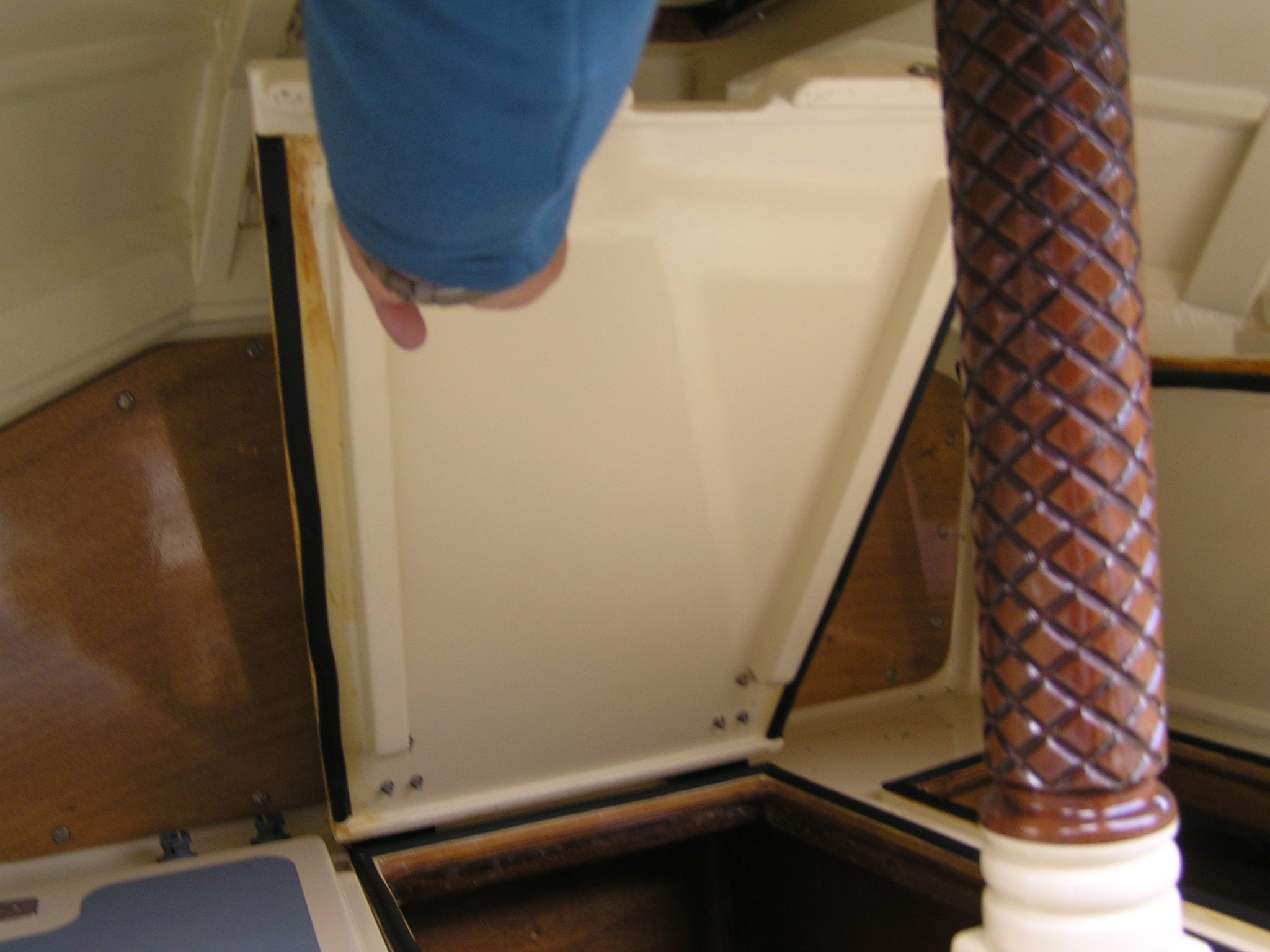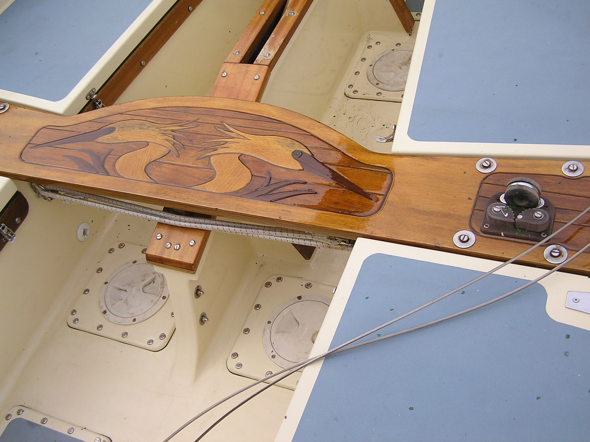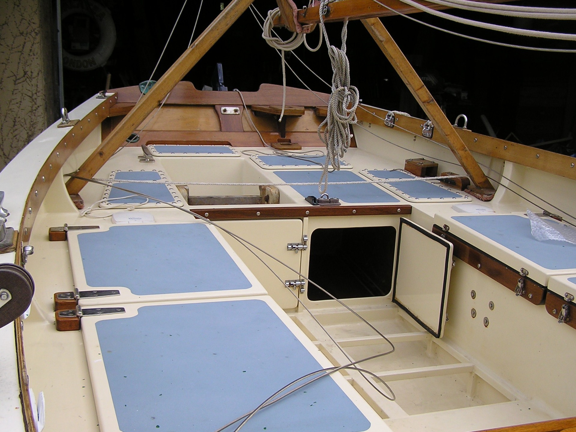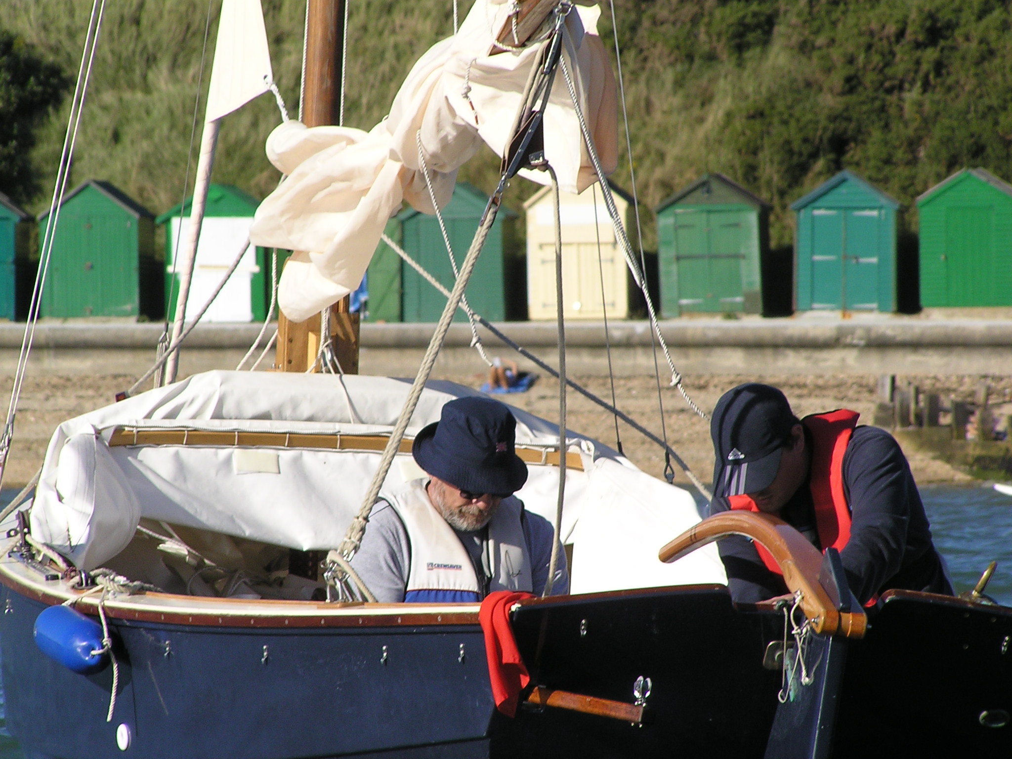 A Montage from the buildersLaunch day -- 6th Feb 2005And Our First Sail In Egret A Trip to Wooton Creek 27 Aug 2005Some photos taken from the ferry, some in the creek A Photo-shoot around Hill Head (our home base)These were taken from a distinctly light and `tippy' GRP tender in an onshore breeze that meant a lot of sculling to keep off of the shore. Some of the jaunty photo angles owe more to the dinghy's performance than to my photographic skills. The tow back into the harbour at the end was very welcome as the sculling hand was getting a little sore. A couple from later.On the way to Wooton, I think. I don't know why they're not sailing as there seems a modest breeze. Perhaps there was a tide-gate issue Egret snugged away in the tiny harbour at Hill Head on The Solent. Some recent photographs (January 2018).We'd had a green tarpauline over her, which had begun to disintegrate, so we replaced it and cleaned out the green debris. These are the "after the vacuuming" photos. With the mast and spars down, there are quite a few ropes and wires around, but most are out of the way onece the rig is up. As a gunter yawl, she has quite a few strings to pull, which is great for kids as they really feel part of the crew. We have two sets of spar sissors, this set for when the mast and spars are don and a simple set for everyday use. The mizzen mast is a simple tapered square poll that could be unstayed, but does have stays if one wants hem. The mizzen is a simple triangular sail with a "wishbone" to set the sail shape. We can't put up the mast where she is in the garden because that telephone ewire is in the way. I must put the wheel back on and move her out a bit. The bilge pumps, one each side, have diverter valves and double as ballast tank fill/empty pumps.