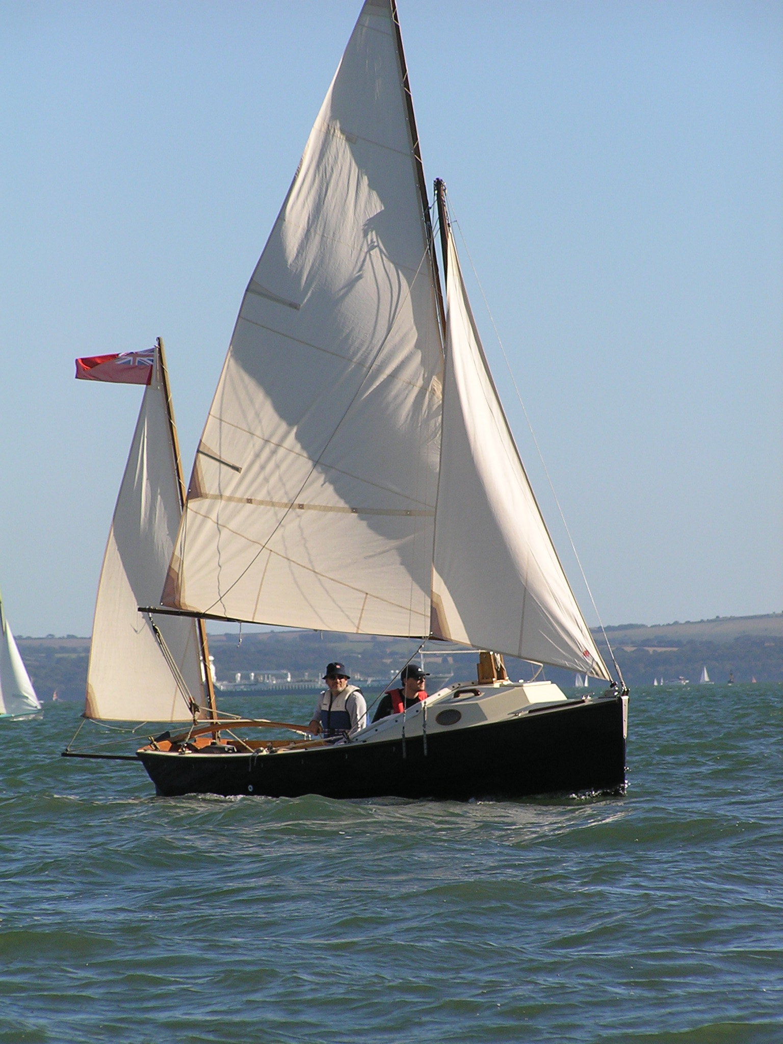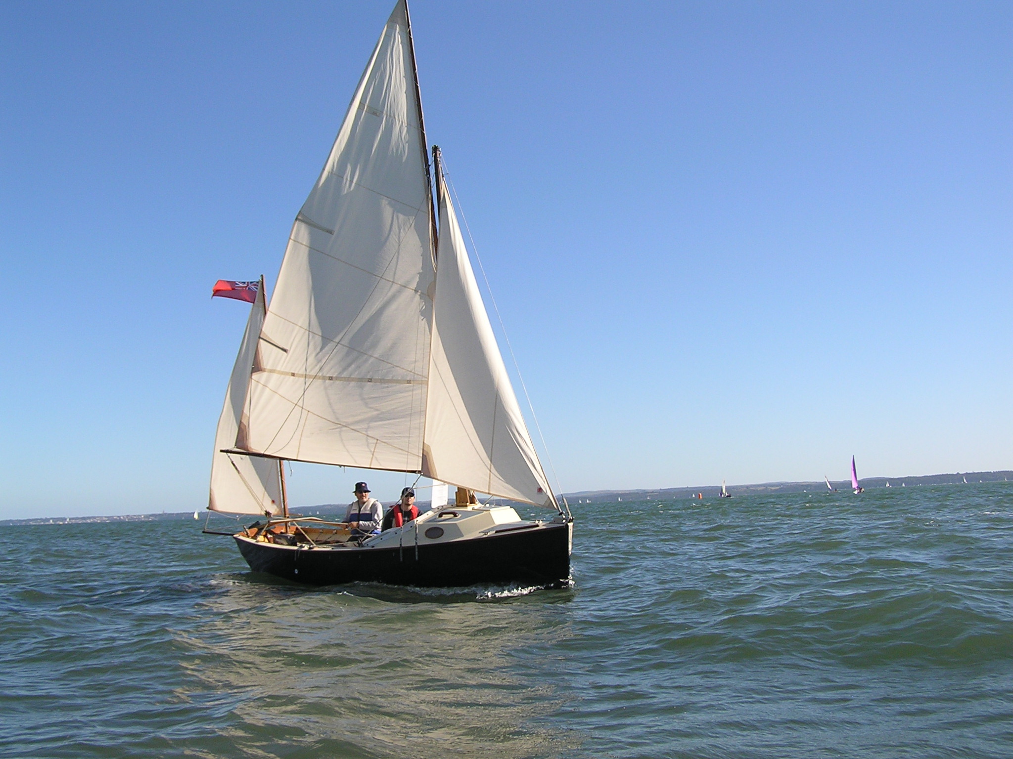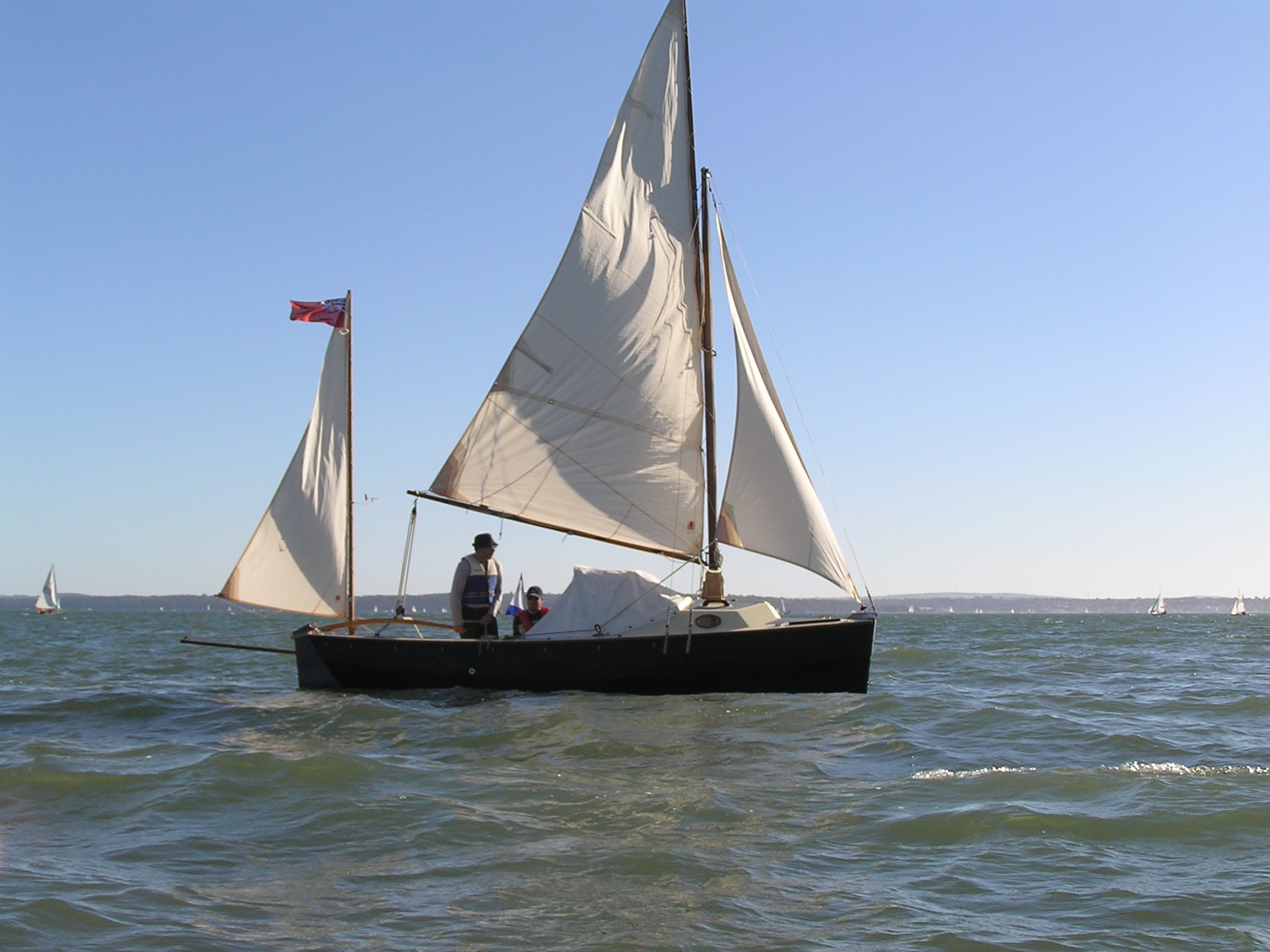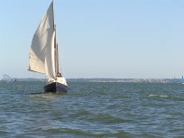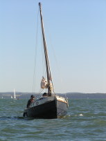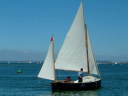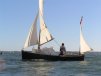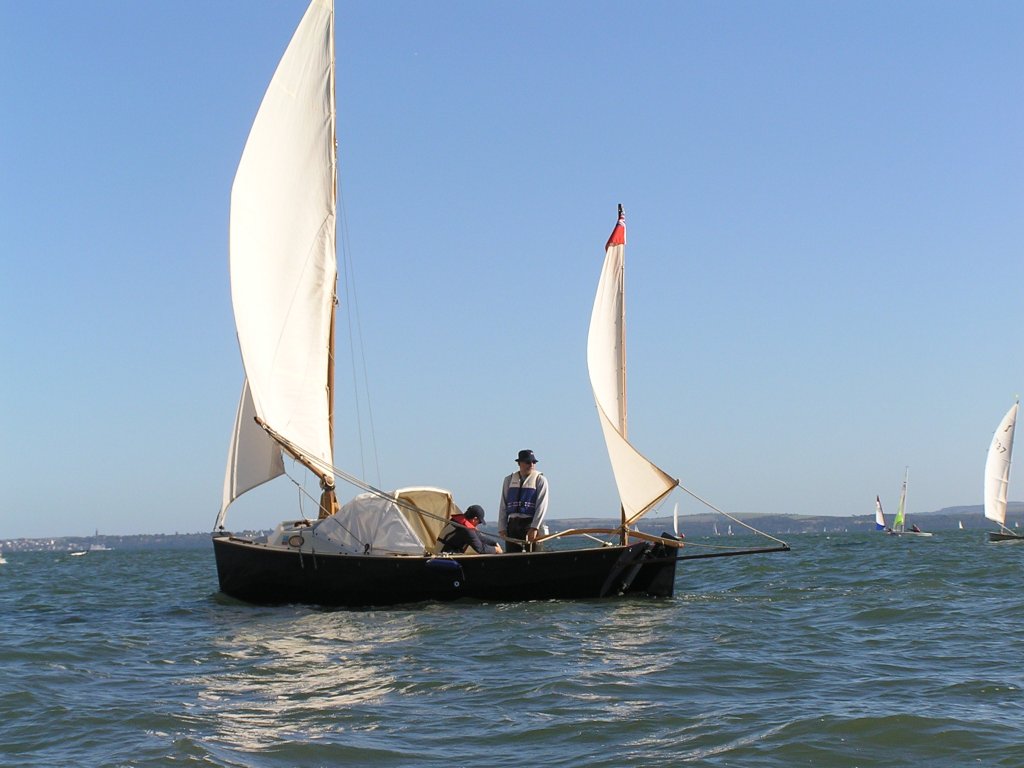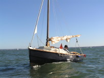 Egret is a Highlander 18 designed by Selway Fisher Design ((http://www.selway-fisher.com)) and featured on their website. The highlanders are a range of boats that are primarily dayboats, though the smallest is pehaps closer to dinghy and the largest is perhaps a weekender. She was built for themselves by two sailing enthusiast who are high quality woodworkers, specialising mostly in church fitting, so as you can imagine, she was built well and beautifully. She's wood-epoxy, mostly in ply and painted with `Perfection 709', but with the brightwork mostly in solid timber. To get an idea of the standard, have a look at the `barleytwist' mast support inside the cuddy and the thwart, which is carved and inlaid. The `standard' Highlander design uses a spritsail rig, but it also has lugger and gunter variations of which Egret uses the latter variation. Egret's internal layout has also been extensively adapted from the original design by the use of a different locker top construction and pumped ballast tanks rather than the standard self-filling and emptying design. The cuddy really is just that and no more on the Highlander 18, so this really is an open boat. Only the 19'6" version that has a true (small) cabin. On Egret, the builders decided to reduce the cuddy a little more, and then `overcompensate', by adding a very generous spray hood that together with the cuddy encloses quite a long space, nearly half the length of the cockpit. Plenty long enough for camping and the "zip in back" give a good volume and passable privacy. Since buying her, we've also added a proper cockpit tent that gives full sitting headroom over the whole cockpit area. Startlingly spacious and quite cosy. It's a good solid canvas tent, proofed and fairly easy to set. Both spray hood and tent are arch-topped, rather than over-boom, to ensure good headroom. The sides on the tent may each be rolled up, as may be the after panel, giving plenty of entilation options. She has loads of locker space along both side seats and across the centre of the cuddy. One, to starboard, contains a Porta-Potti. The extreme fore-peak and extreme stern comprise sealed boyancy tanks, so she has buoyancy aplenty. Ballast is 400lb of water stored in a central tank around the lower part of thecentreboard housing. The design calls for fill and empty holes, but the builders preferred to pump the water in and out, so she has twin diaphragm-type pumps that can be either fill/empty the tanks, or both can bale. The father and son who built her did a superb job. The scantlings were all increased a little and all the epoxy fillets are pretty much perfect. I noticed that even the reinforcing pads (for everything) are filleted and sanded smooth. Wow! It was their idea to make the cuddy a little smaller and fit a large generous spray-hood. Good move in my opinion. The outboard is a 3.5hp 2-stroke Tohatsu, that drives her to around hull speed at half throttle. Upping the power just makes it noisier. She sails extremely well, giving the owners of some popular fibeglass dayboats that shall remain nameless cause for envy. She'll get to hull speed in around F3 and I'm pretty sure we've had her surfing on a reach. We were once caught out under full sail in the Solent by a clear-air sqall that went from F1 to F5 in around 15 seconds. She just weathercocked, so we reefed, looked around and struck the main entirely. In the next hour as we ran (perhaps for the best as she doen't point all that well under just headsail and mizzen) to Hill Head, the wind rose to F7. By the time we arived back, we were a bit wet from spray, but feeling fairly comfortable all things considered. In extremis she has a 4kg Rocna anchor that should hold her in just about anything. She has a good galvanised trailer and is very trailable indeed, weighing in at perhaps 3/4 ton including trailer and excluding the 400lb of seawater. Here's a letter from one of the guys who built her, from when we contacted him.