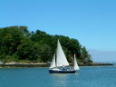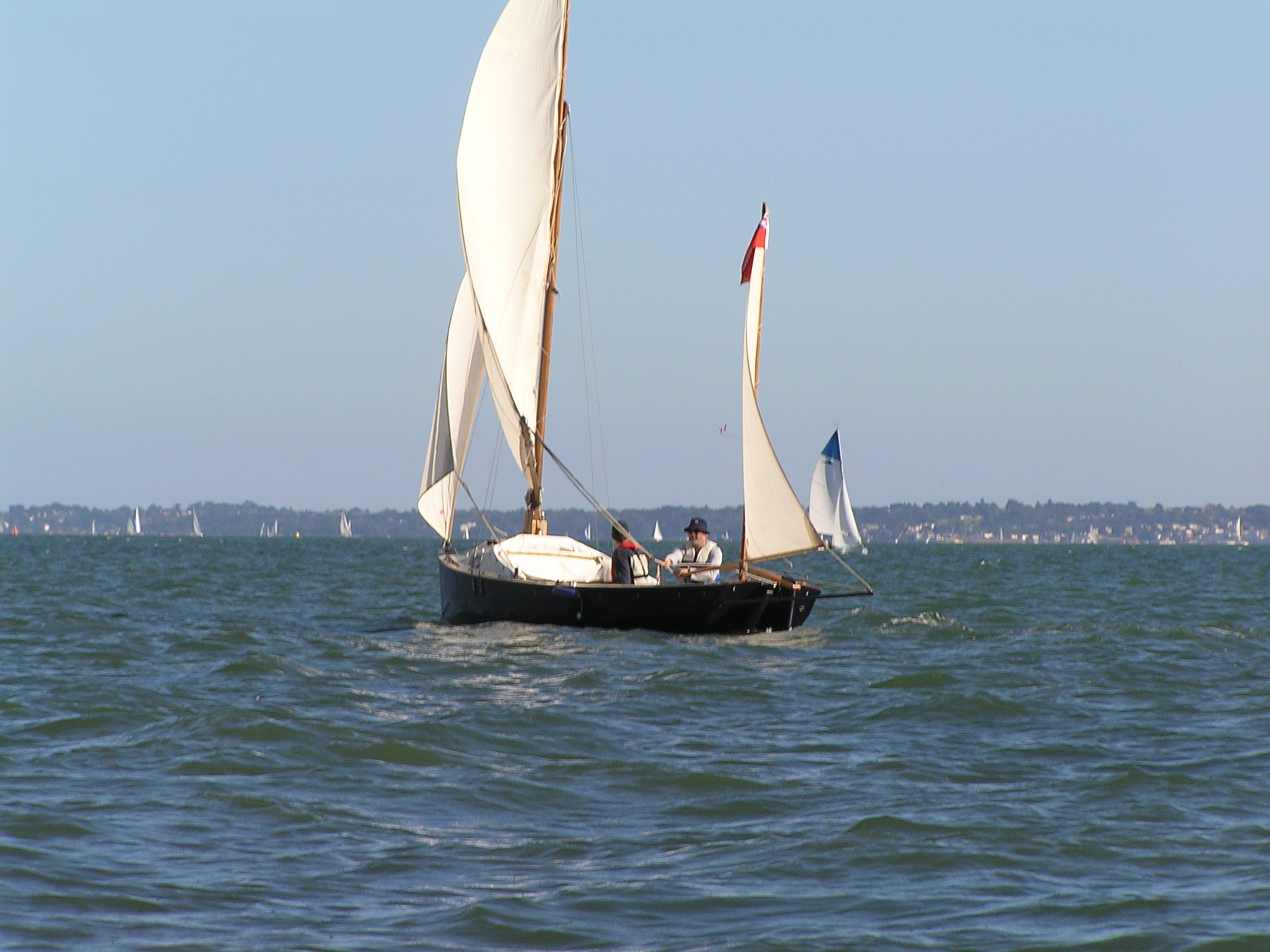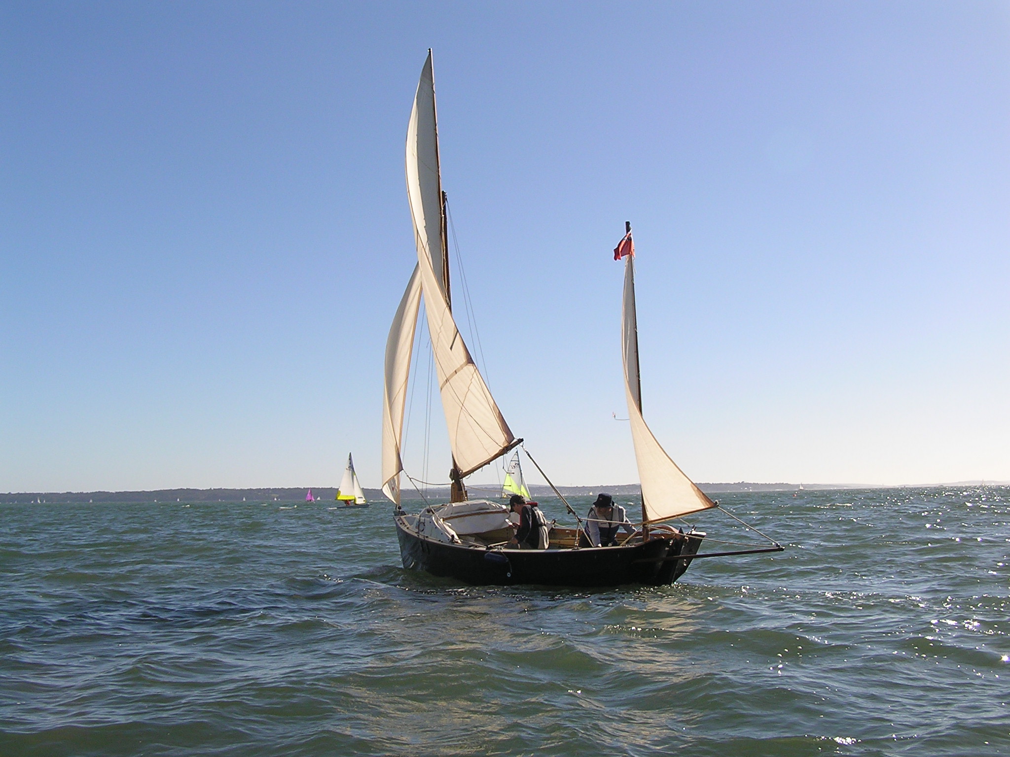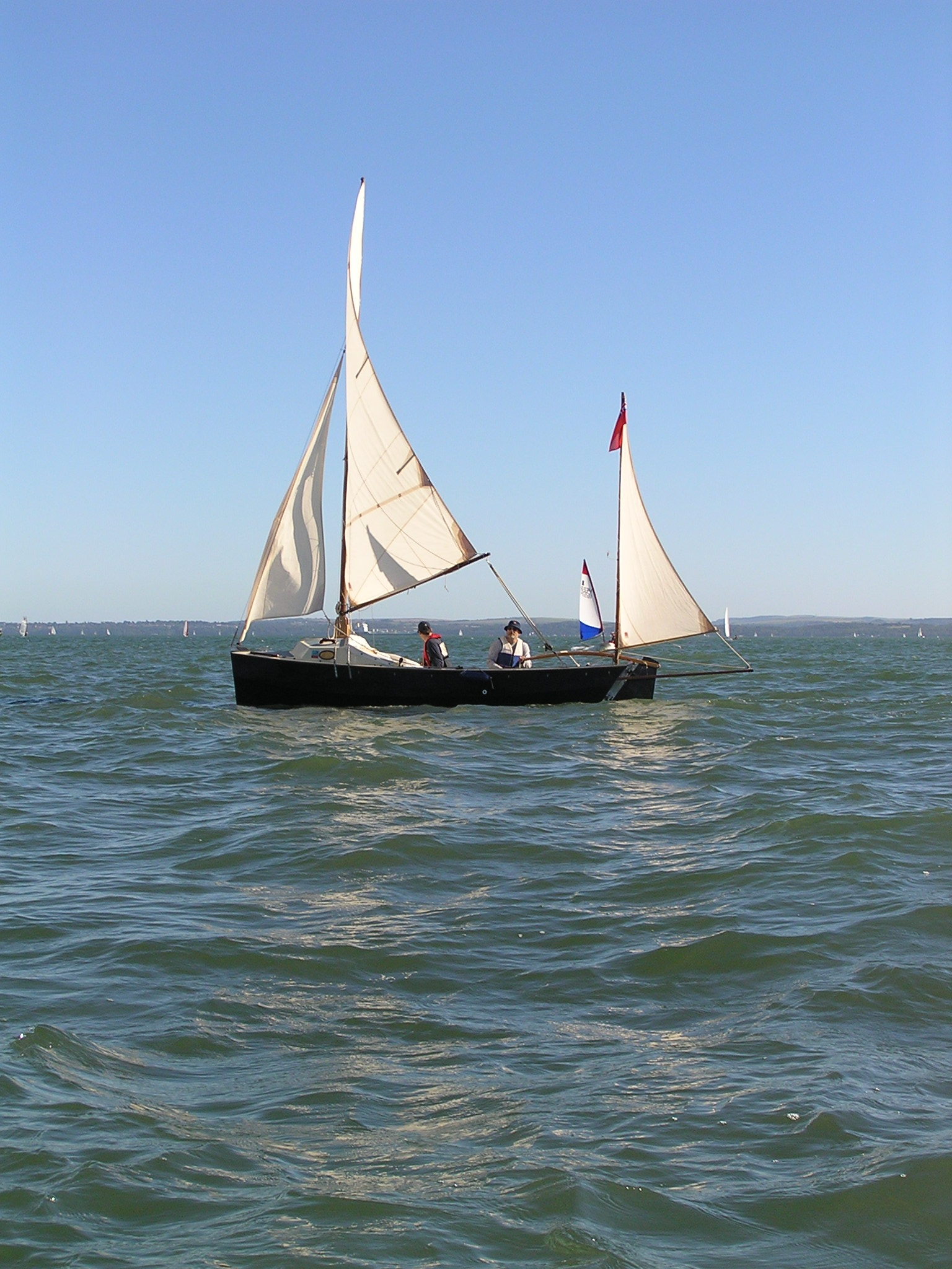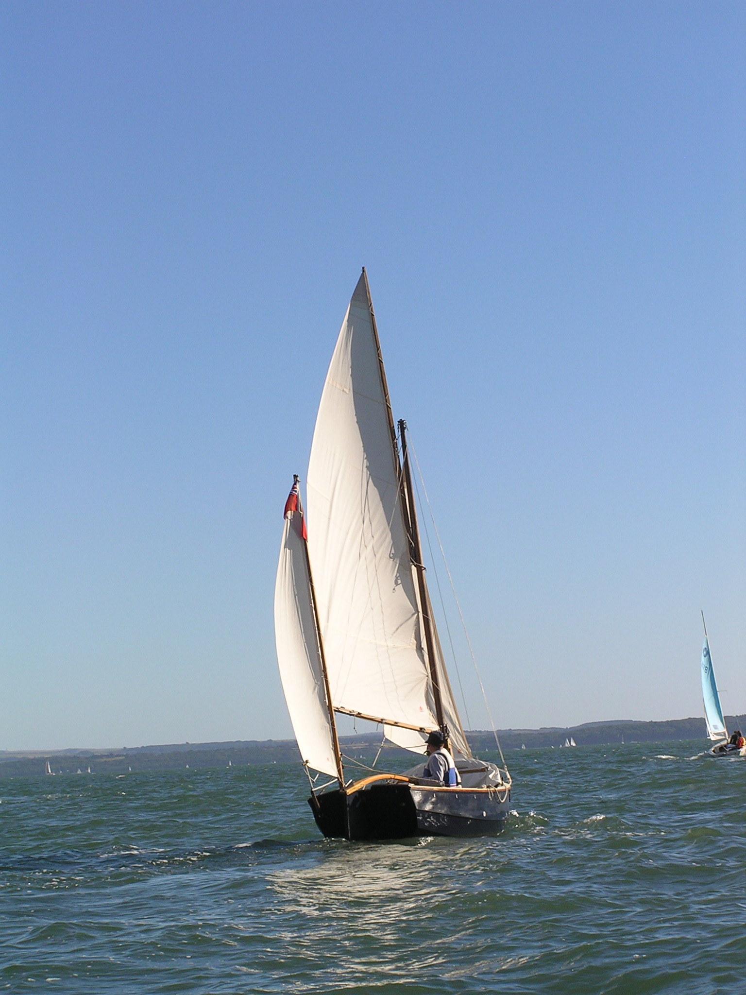 Egret is a Highlander 18 designed by Selway Fisher Design ((http://www.selway-fisher.com)) and featured on their website. The highlanders are a range of boats that are primarily dayboats, though the smallest is pehaps closer to dinghy and the largest is perhaps a weekender. She was built for themselves by two sailing enthusiast who are high quality woodworkers, specialising mostly in church fitting, so as you can imagine, she was built well and beautifully. She's wood-epoxy, mostly in ply and painted with `Perfection 709', but with the brightwork mostly in solid timber. To get an idea of the standard, have a look at the `barleytwist' mast support inside the cuddy and the thwart, which is carved and inlaid. The `standard' Highlander design uses a spritsail rig, but it also has lugger and gunter variations of which Egret uses the latter variation. Egret's internal layout has also been extensively adapted from the original design by the use of a different locker top construction and pumped ballast tanks rather than the standard self-filling and emptying design. The cuddy really is just that and no more on the Highlander 18, so this really is an open boat. Only the 19'6" version that has a true (small) cabin. On Egret, the builders decided to reduce the cuddy a little more, and then `overcompensate', by adding a very generous spray hood that together with the cuddy encloses quite a long space, nearly half the length of the cockpit. Plenty long enough for camping and the "zip in back" give a good volume and passable privacy. Since buying her, we've also added a proper cockpit tent that gives full sitting headroom over the whole cockpit area. Startlingly spacious and quite cosy. It's a good solid canvas tent, proofed and fairly easy to set. Both spray hood and tent are arch-topped, rather than over-boom, to ensure good headroom. The sides on the tent may each be rolled up, as may be the after panel, giving plenty of entilation options. She has loads of locker space along both side seats and across the centre of the cuddy. One, to starboard, contains a Porta-Potti. The extreme fore-peak and extreme stern comprise sealed boyancy tanks, so she has buoyancy aplenty. Ballast is 400lb of water stored in a central tank around the lower part of thecentreboard housing. The design calls for fill and empty holes, but the builders preferred to pump the water in and out, so she has twin diaphragm-type pumps that can be either fill/empty the tanks, or both can bale. The father and son who built her did a superb job. The scantlings were all increased a little and all the epoxy fillets are pretty much perfect. I noticed that even the reinforcing pads (for everything) are filleted and sanded smooth. Wow! It was their idea to make the cuddy a little smaller and fit a large generous spray-hood. Good move in my opinion. The outboard is a 3.5hp 2-stroke Tohatsu, that drives her to around hull speed at half throttle. Upping the power just makes it noisier. She sails extremely well, giving the owners of some popular fibeglass dayboats that shall remain nameless cause for envy. She'll get to hull speed in around F3 and I'm pretty sure we've had her surfing on a reach. We were once caught out under full sail in the Solent by a clear-air sqall that went from F1 to F5 in around 15 seconds. She just weathercocked, so we reefed, looked around and struck the main entirely. In the next hour as we ran (perhaps for the best as she doen't point all that well under just headsail and mizzen) to Hill Head, the wind rose to F7. By the time we arived back, we were a bit wet from spray, but feeling fairly comfortable all things considered. In extremis she has a 4kg Rocna anchor that should hold her in just about anything. She has a good galvanised trailer and is very trailable indeed, weighing in at perhaps 3/4 ton including trailer and excluding the 400lb of seawater. Here's a letter from one of the guys who built her, from when we contacted him.
