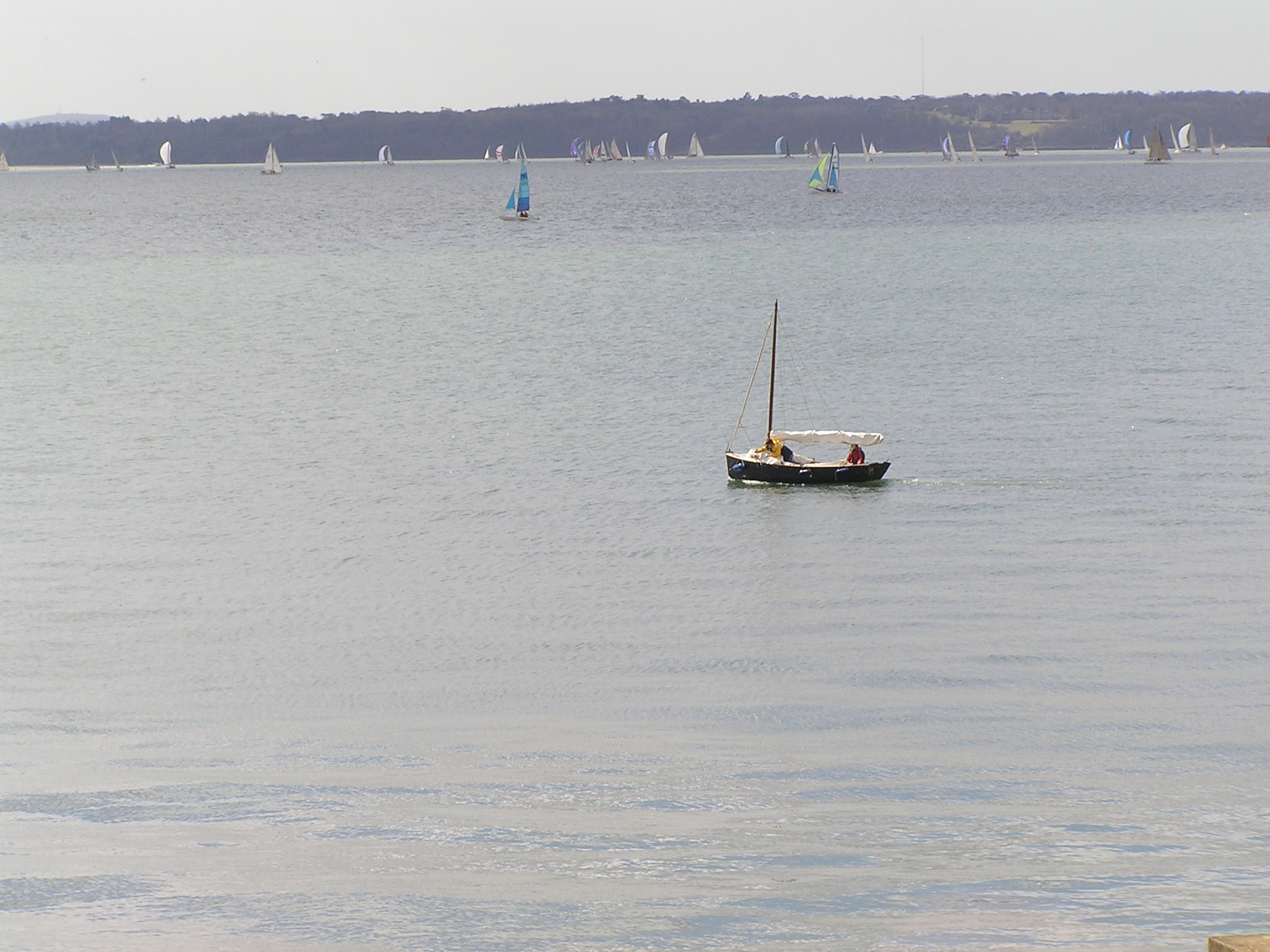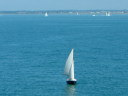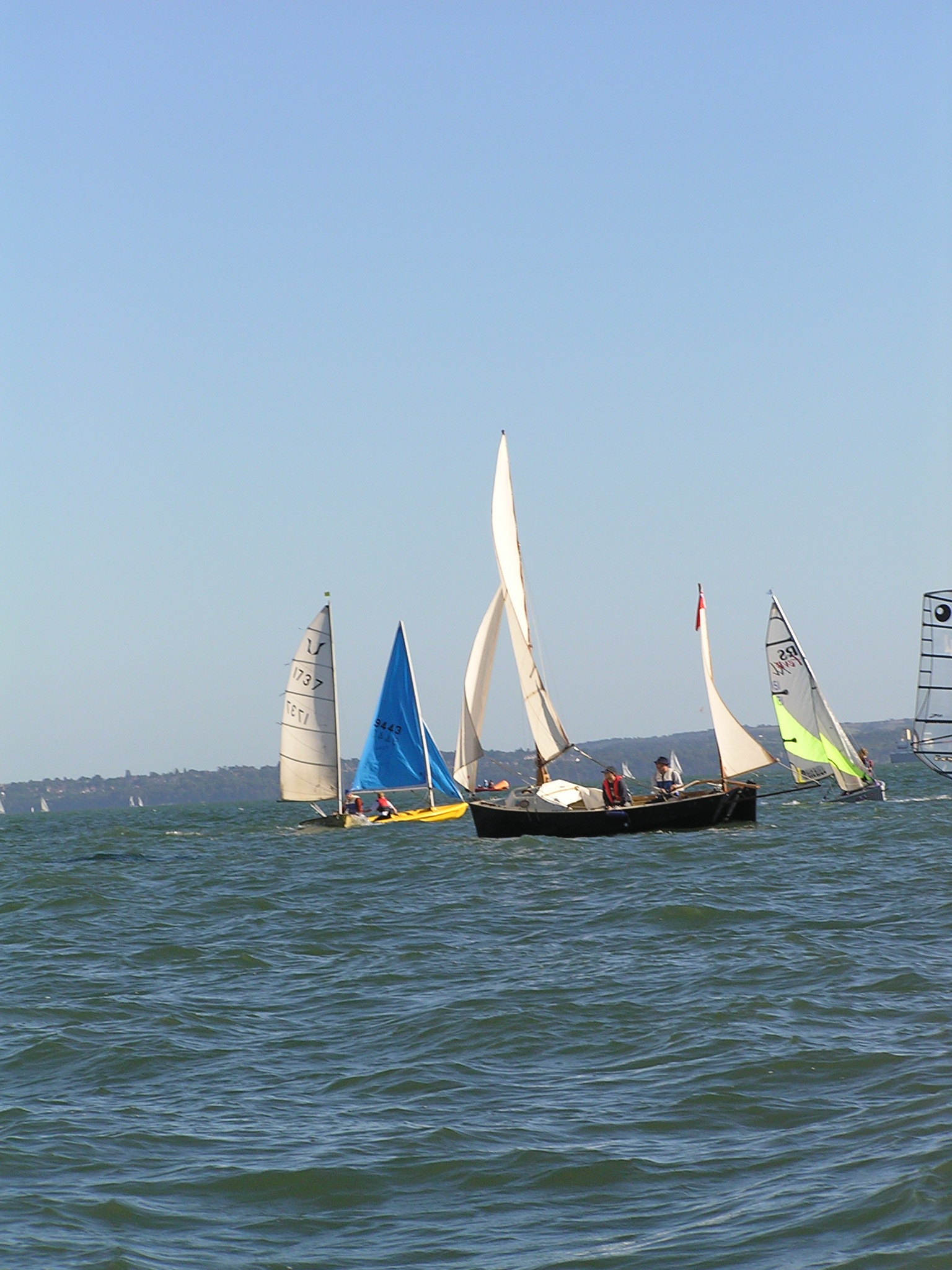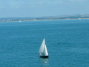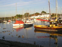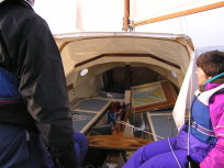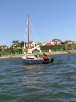 The first photos below is from Launch day, way back in in Feb 2005. We cheated a little during the launch as we were on a concrete ramp and there was some powerboat wash, so the Shampoo (well, Cava actually) was poured over the bows a little after setting sail. Well, OK, some was poured and some was used to toast her. The final picture shows the new cockpit tent that extends the sprayhood to cover the entire cockpit. Physically there's enough space to sleep four, though they'd best be good friends. The remaining pictures are from August that year, one by family from an Isle of Wight ferry, the rest by me from a very tippy tender. Obviously both camera and I made it back OK. |