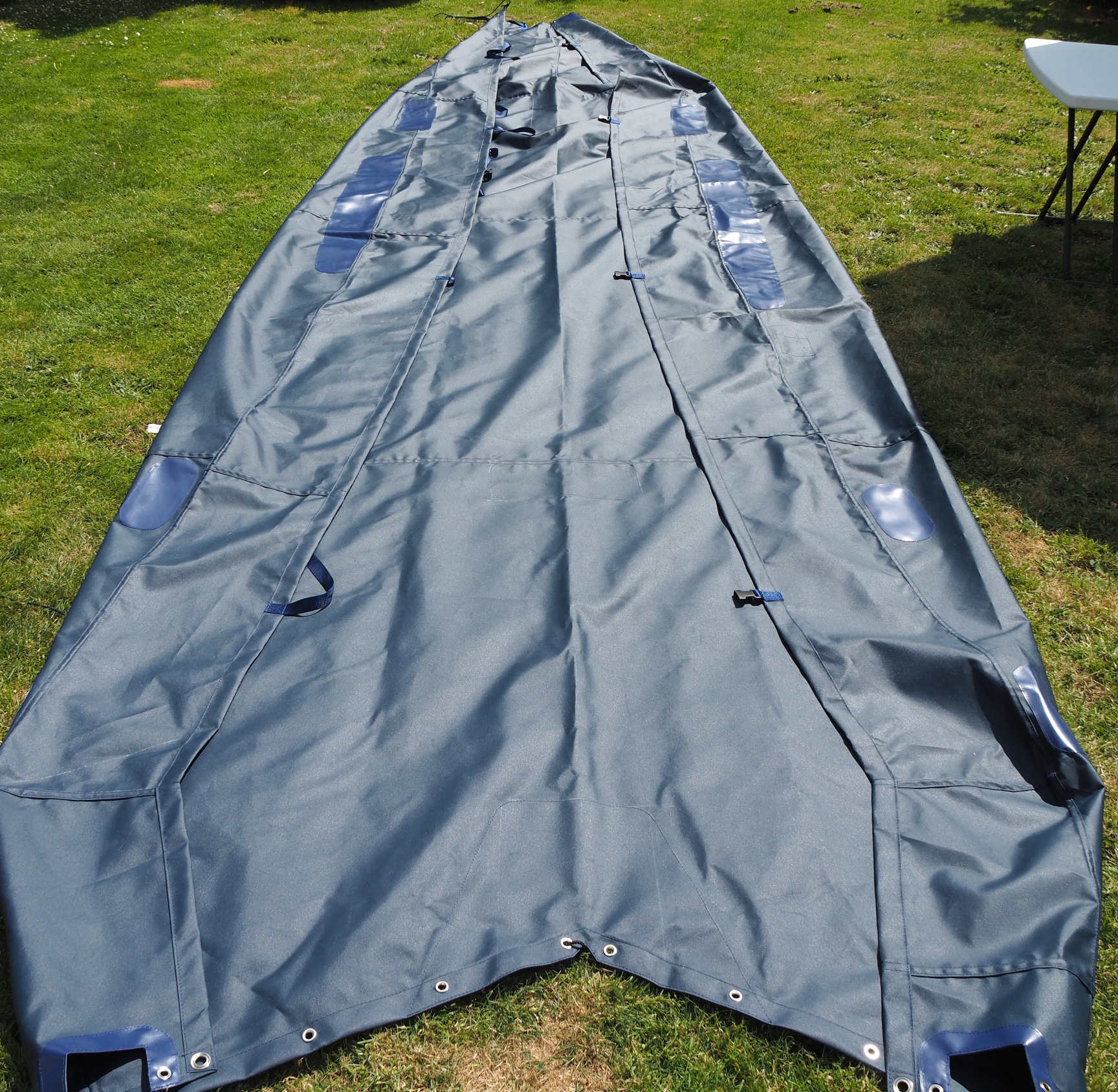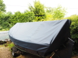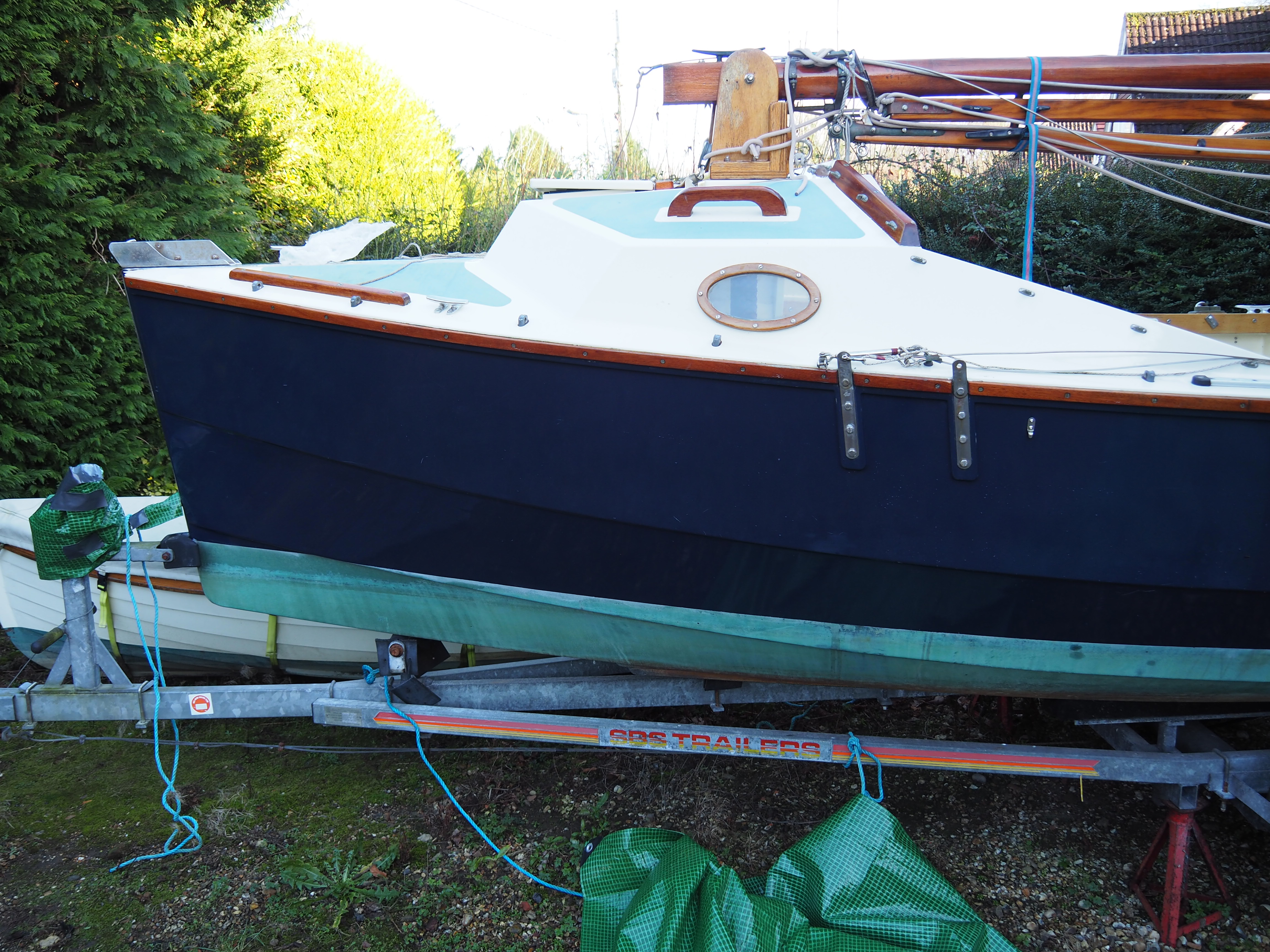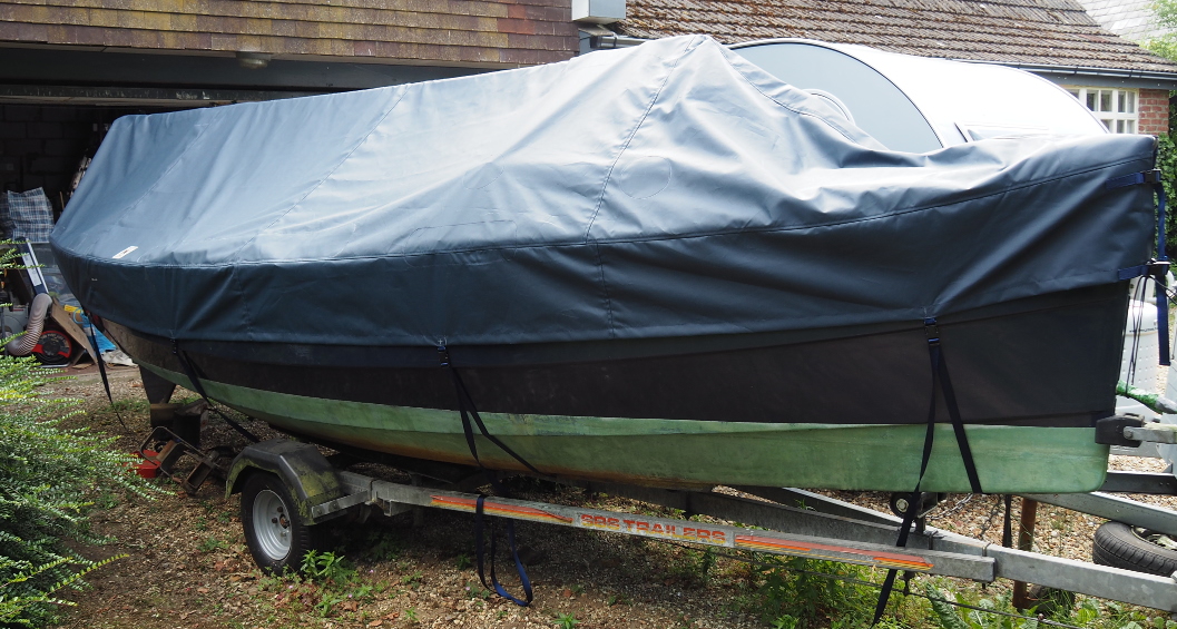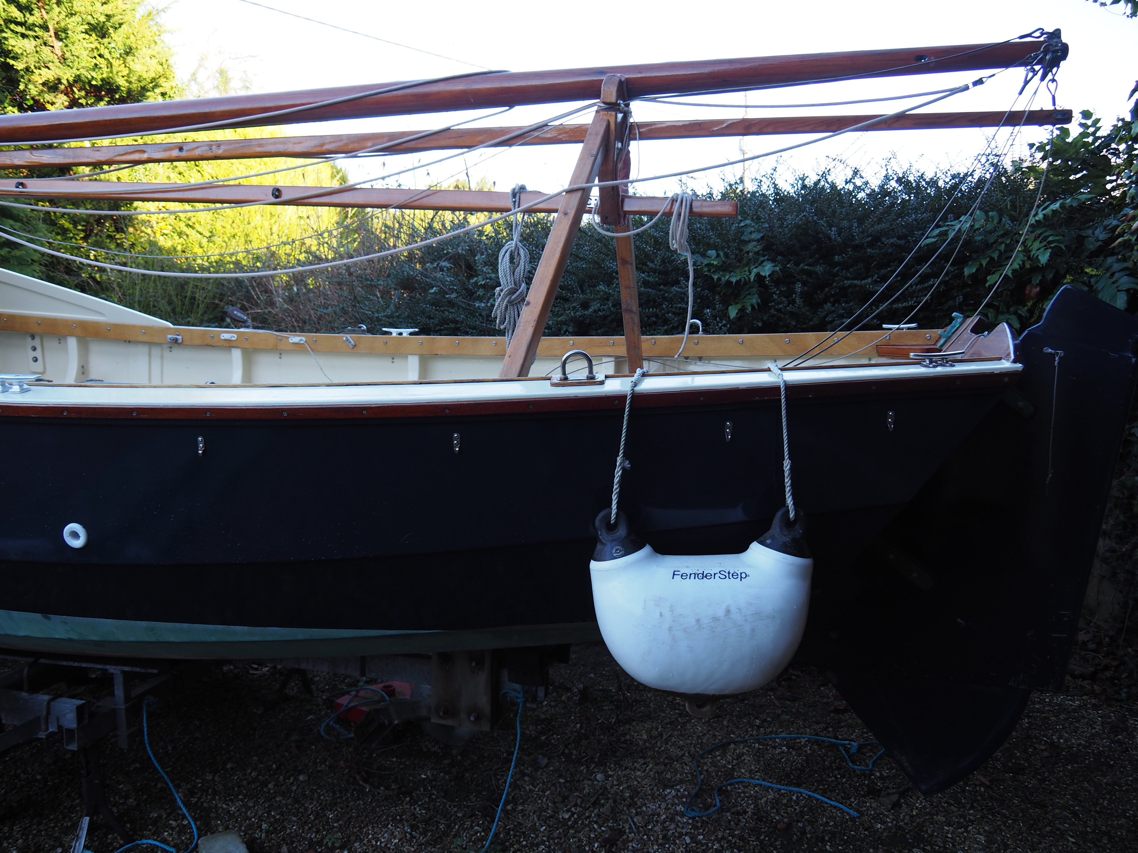 The mizzen and bumkin in place.(The bumkin is a bit longer than it appears here, because of its horizontal angle) Slightly earlier photographs, ditto. (September 2017).New all-over cover by Wilkinson Sails, made from Top Gun fabric. (June 2018).I'd had Wilkinson Sails make a cover for Galatea of this fabric, because Galatea is 120 miles from home and renewing tarpaulins several times each winter was plain silly. Galarea's cover is several years old and still brilliant. I've had a few extra reinforcement patches added and odd bits of seam resewn, but that's all it's nended. I've had no hesitatiuon in having similar covers for our tender Akis and for Egret. The reinforcement patches are, of course, to take the wear that will inevitably happen where bits rub. Patches can be replaced when they tire, rather than having to repair the main cover. Whilst on new stuff, I've also just replaced all of the rollers on the trailer as they were starting to perish, the complete nosewheel assembly, and had recently replaced tyres and brakes parts. I plan to replace (preferably) or failing that repair that cracked mudguard. |