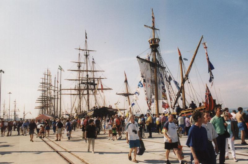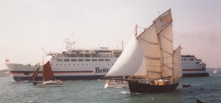 At an outside corner in the main tallship area I looked both ways and, like many I guess, had to have a record of the number of ships in just this area. These thumbnail link to images a little over twice the size (and about 65k each). A litle further along towards the sun are the replica of the Matthew, John Cabot's ship (nearest), and behind that, the Grand Turk, the ship built for the Hornblower television series. A have a love for the purposeful elegance of luggers in general, and these superbly powerful Breton fishing boats in particular. I think this is the class known as a bisquine. Timing and lens swaps (I must get a zoom) stopped me getting the shot I wanted -- the Breton fisherman with the Brittany Ferries ship livery behind. These were the closest I managed. Ho Hum. |